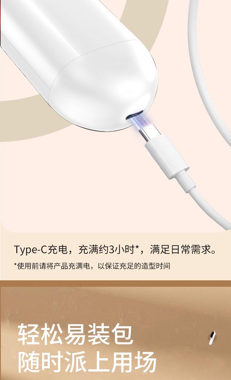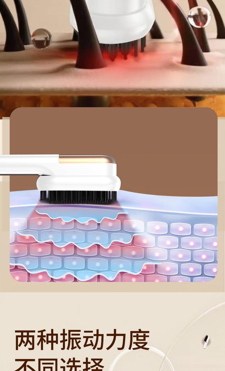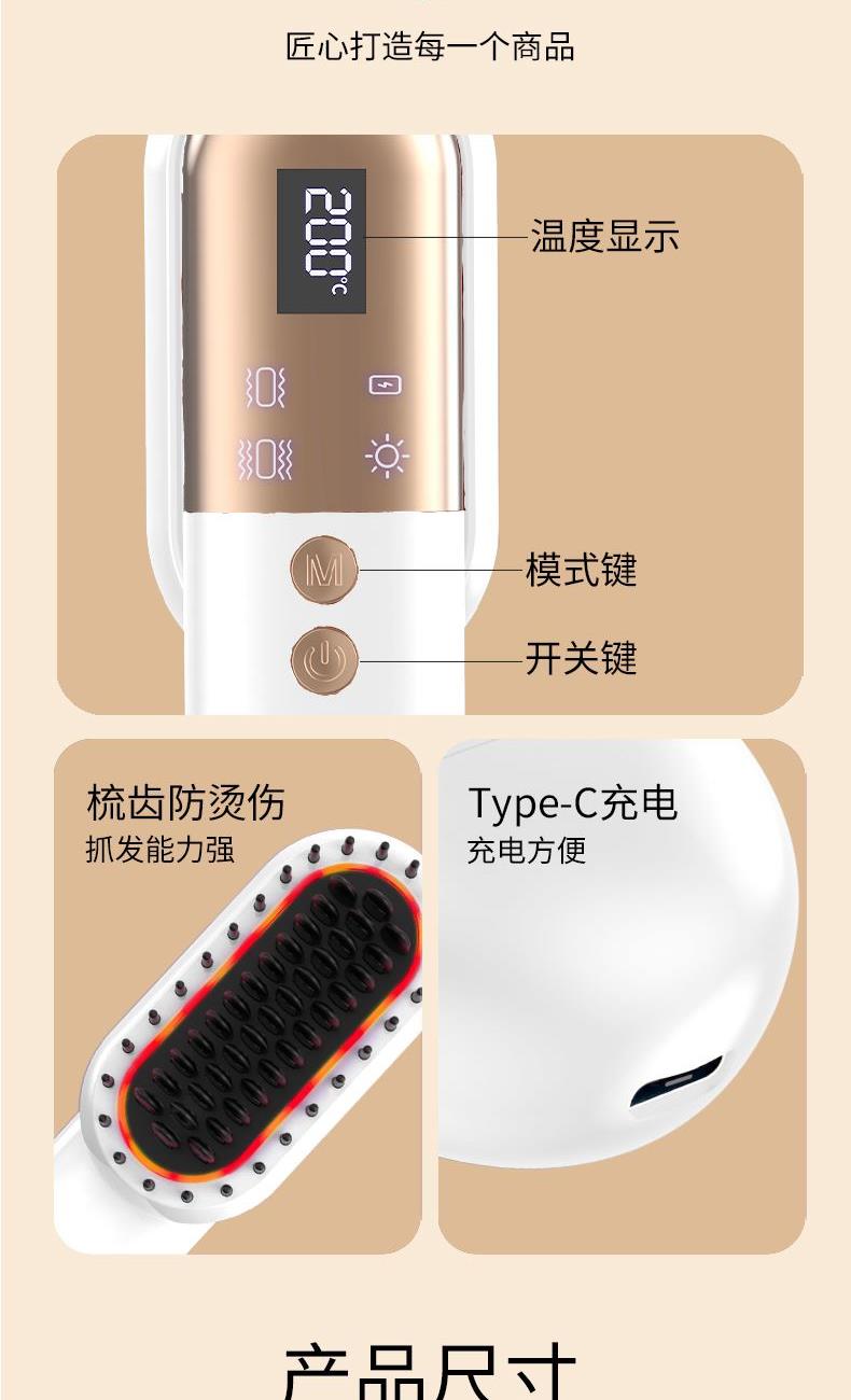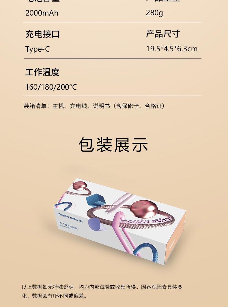 型號 MR7066 產地 浙江溫州 凈重 280g 毛重 420g 包裝尺寸 24X10X7cm 大箱尺寸 40×36×43cm 續航 約40min 充電時間:≈180min 充電電壓:5V/2A 工作功率:28W 充電接口:Type-C 電池容量:2000毫安 執行標準:GB4706.1-2005/GB4706.10-2008 配件:主機,充電線,說明書 賣點: 震動按摩,2檔力度,按摩 速熱技術,3檔溫度適合不同發質 圓潤梳齒,按摩不傷頭皮,蓬松順發 紅光光波理療,呵護頭皮 流線型握把,輕巧易握,小巧收納
