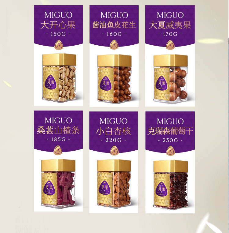 大開心果150g 大夏威夷果170g 小白杏核220g 醬油魚皮花生160g 桑葚山楂條185g 克瑞生葡萄干 230g